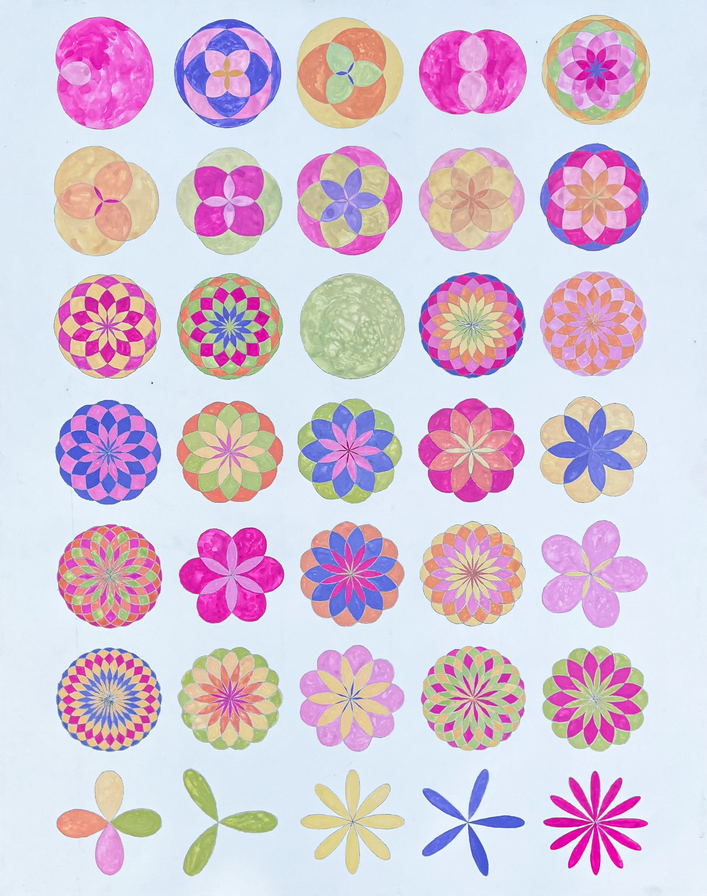 Rhodonea Curve Garden (Polar Plots of Sinusoidal & Cosinusoidal Functions), 2022 Gouache and graphite on canvas 20 x 30 in